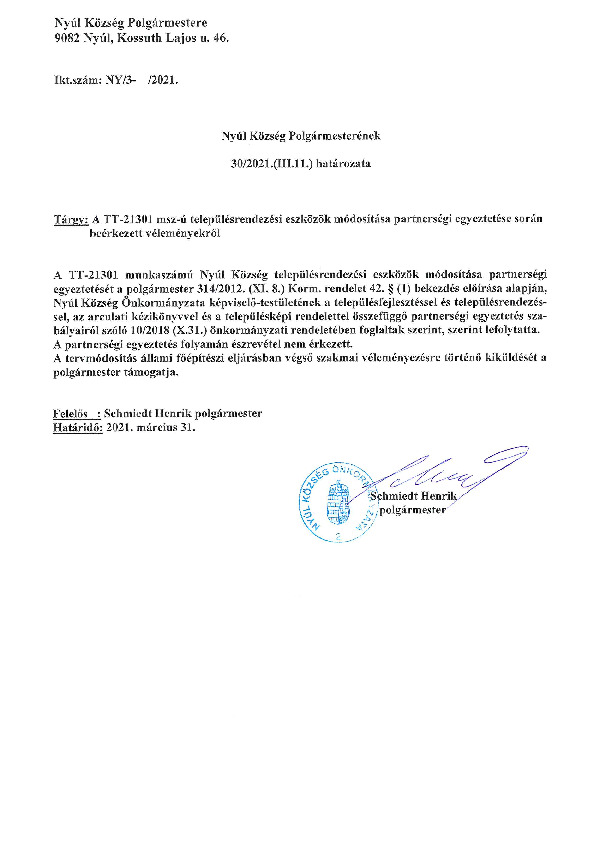 Polgármesteri határozat - TT21301 msz-ú rendezési terv módosítás partnerségi egyeztetés lezárása