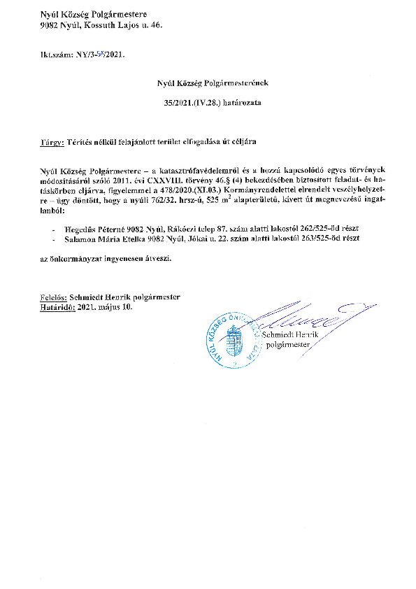 Polgármesteri határozat - térítés nélkül felajánlott terület elfogadása út céljára