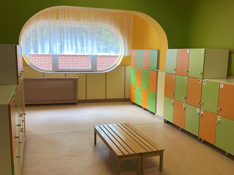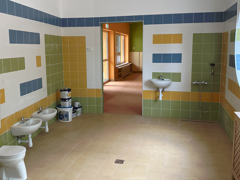 A település önkormányzata a megnövekedett társadalmi igények kielégítése céljából a meglévő kétcsoportos bölcsődéjét bővítette, melyhez Uniós pénz-forrást vont be. A meglévő bölcsőde bővítése a szűkös területi adottságok és a meglévő beépítés figyelembevételével az épület utcafronti oldalán volt lehetséges. A bővítés funkcionális kialakítása szerencsésen megoldható volt a meglévő öltöző bővítésével az épület homlokzati síkja elé, majd ehhez kapcsolódóan a gyermekfürdő folytatásában a foglalkoztató kialakítása. A foglalkoztató elé e meglévő fedett terasz befordul és biztosítja a játszóudvari kapcsolatot is. A bővítés megvalósításához el kellett bontani az akadálymentes közlekedést biztosító rámpát, amit az új homlokzati sík elé kellett visszaépíteni. El kellett bontani továbbá az utcai kerítést és az új telekhatárra megépíteni. A telek szükséges bővítése miatt az ingatlan előtt húzódó járdát át kellett építeni az új kerítés elé, továbbá a meglévő csapadékvíz elvezető árkot le kellett fedni, mivel a jogszabályokban minimálisan előírt parkolóhelyek számát így tudtuk biztosítani. Szükséges volt még a bővítés miatt a további 1 db árnyékolóval ellátott homokozó megépítése is a játszóudvaron. A személyzet bővülése miatt a meglévő személyzeti öltözők is bővítésre kerültek, ez a takarítószer tároló és öltöző közötti fal elbontásával volt megoldható. A bővítéssel 12 új férőhelyet tudtunk létrehozni.